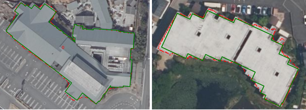 複雑な建物形状もsimplify係数の設定によって可能な限りフィッティングできる。入力元の衛星画像に整形した建物ポリゴンをオーバーレイ
