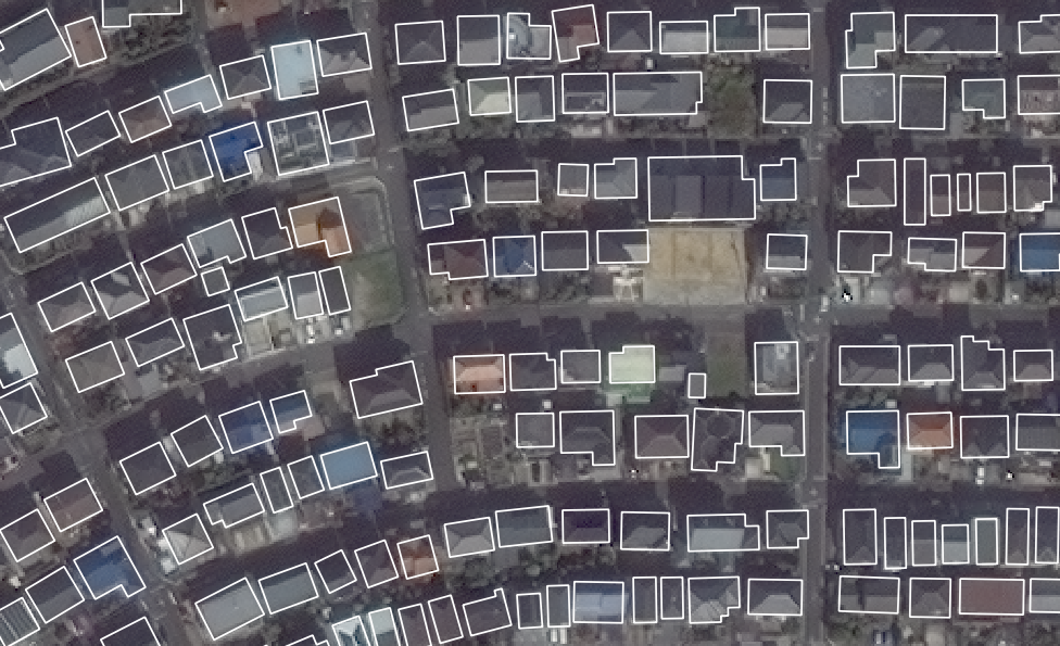 衛星画像を用いた建物オートマッピングの最終成果。