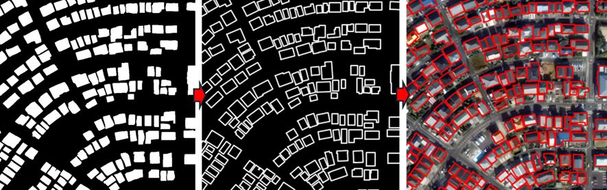 WorldView-2など50㎝解像度の衛星画像からTransformerを使用して建物のセグメンテーション・マスク画像を生成して建物ポリゴンを作成することができます。 しかし、建物のマスク画像から直線的な形状や建物の角をシンプルにポリゴン化することは簡単ではありません。 既存のアルゴリズムや後処理でポリゴン形状を単純化することはできますが、それでも建物の形状をよりシンプルで自然な形状でポリゴン化することには限界があります。 そこで、オービタルネットでは、AI処理で生成した建物セグメンテーション・マスク画像から、建物の形状をよりシンプル且つ自然な形状でポリゴン化する建物整形アルゴリズムを開発しました。 これで、衛星画像から綺麗な建物マップを作成することができるようになりました。