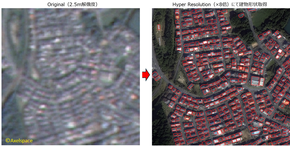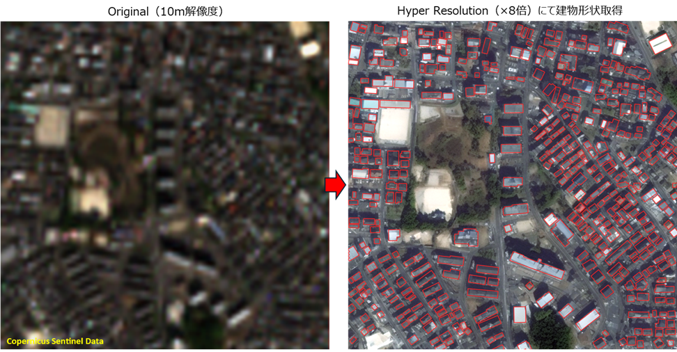 Sentinel-2の衛星画像(10m解像度)から建物形状の生成下の画像は、Sentinel-2の衛星画像(10m解像度)から建物形状を生成したものです。 10m解像度の衛星画像を×4倍×2倍に超解像化して約1.25mの解像度になります。 しかし元の画像が10mのため、10mピクセルで表現できない建物は超解像化しても再現することはできず、 10mピクセルで再現できる建物だけが超解像化によって再現・鮮明化できます。 この際、10mピクセルで表現できない建物は超超解像化で総描化した一塊の建物群になります。 建物及び総描化した建物群のエッジが鮮明になることで、空中写真(25cm)のデータセットで学習したモデルにて推論し、建物形状を取得できるようになります。