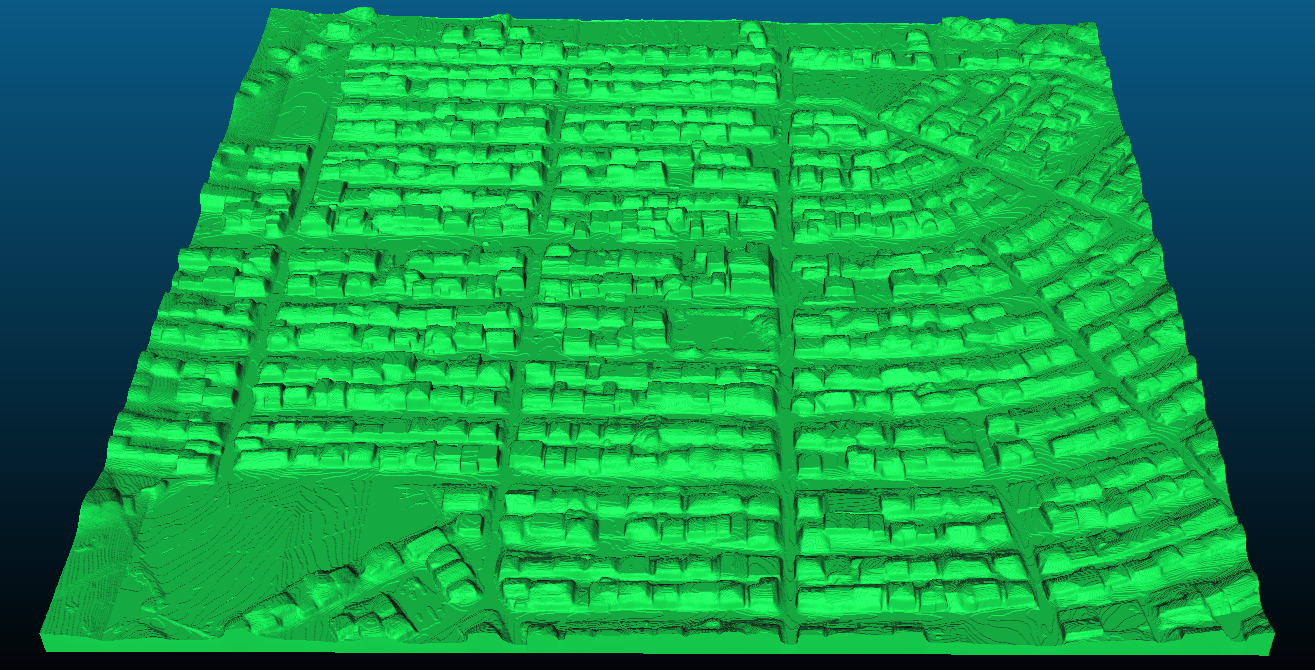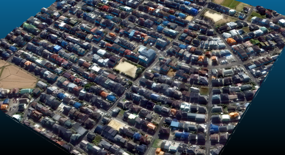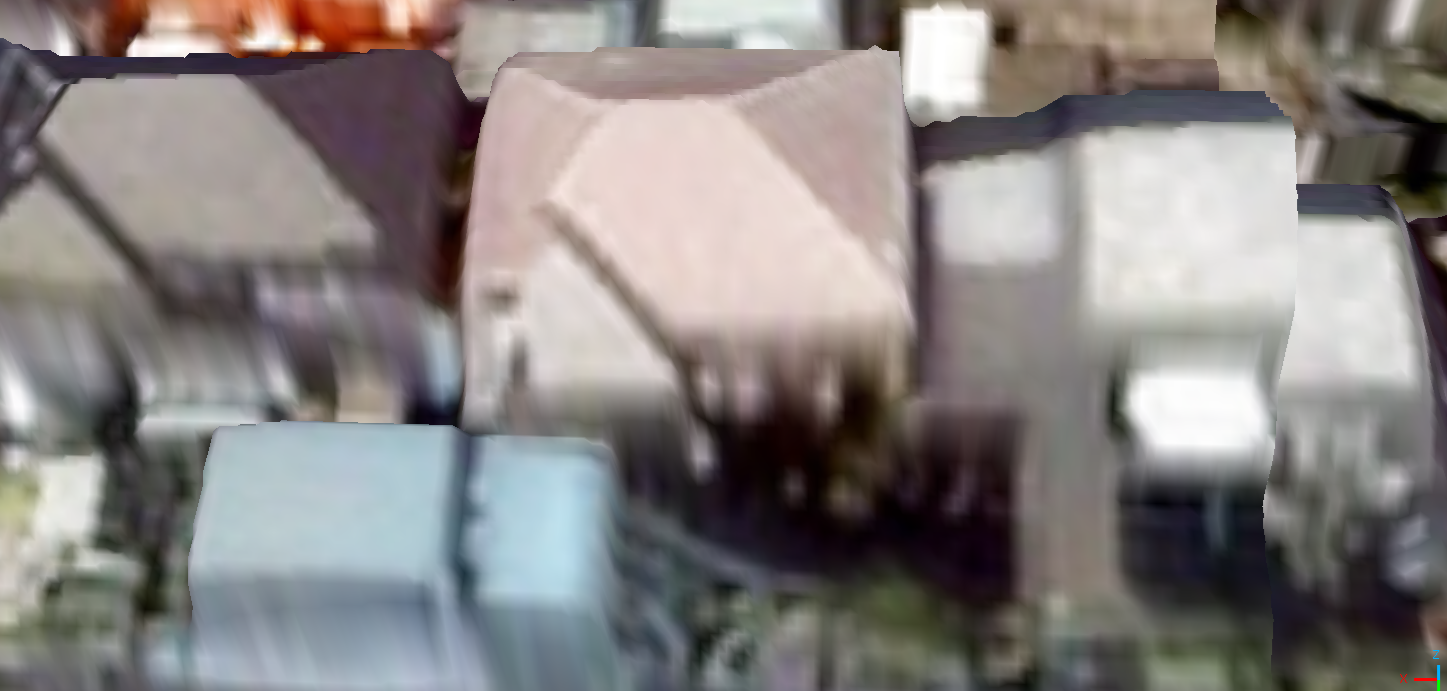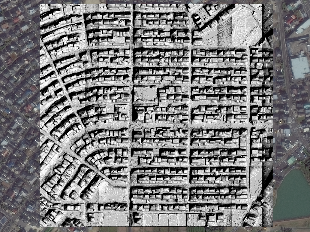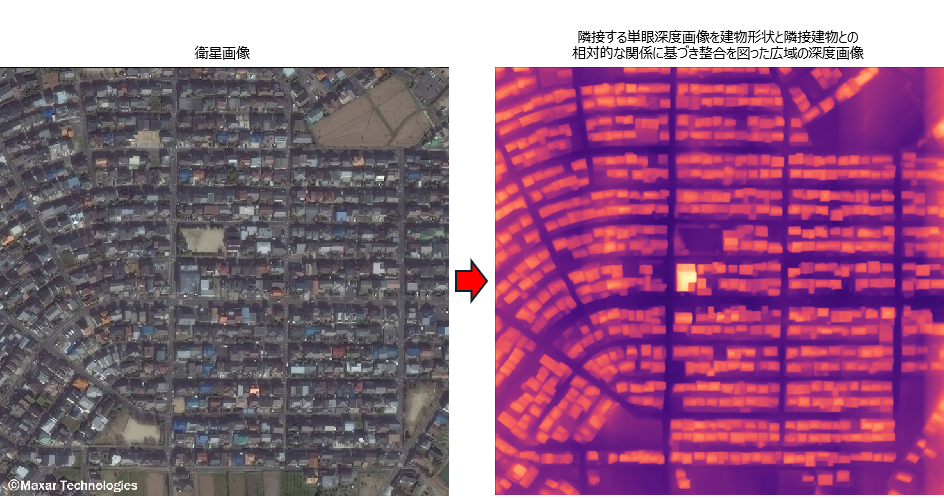 (左画像)単眼深度推定に入力する衛星画像 (右画像)隣接する単眼深度画像を建物形状と隣接建物との相対的な関係に基づき整合を図った広域の深度画像単眼深度推定で生成した3次元サーフェース・モデル。寄棟屋根の形状が再現できていることがわかる。こちらも建物が未収しているが寄棟屋根や切妻屋根の形状が再現できている。単眼深度推定で生成した深度画像からDEMを生成してGISに展開して作成した陰影図3次元サーフェース・モデルで作成した鳥観図