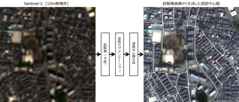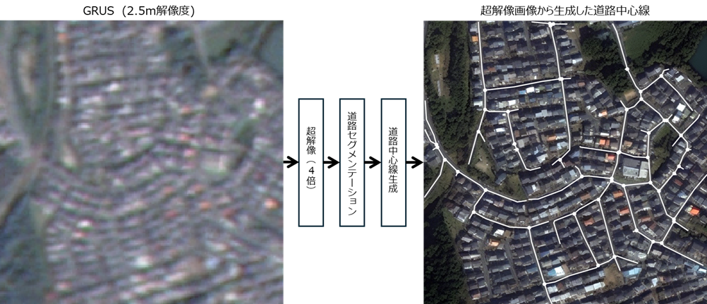 衛星画像の超解像化によって従来困難であった解析ができるようになります。 従来であれば衛星画像の解像度からSentinel-2(10m)の衛星画像は建物や道路の識別は困難であり、 GRUS(2.5m)の衛星画像は幹線道路を除く生活道路の識別は困難です。 そこで超解像技術を用いて画像を4倍に精細化にすることによってそれらの識別ができるようになります。 ここでは超解像化の活用事例として、超解像化した衛星画像から道路のセグメンテーション、道路中心線の生成事例をご紹介します。 道路中心線は道路部をセグメンテーションで領域抽出したのち、細線化・総描化処理によってシンプルなベクター・ラインを生成したものです。