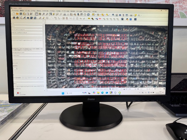QGISレイヤの衛星画像の切り取り、衛星画像の超解像→セグメンテーション→正規化ポリゴン(Flatgeobuf形式)をサーバー側でパイプライン実行してQGISレイヤに追加するQGISプラグインデモ展示等を行いました。