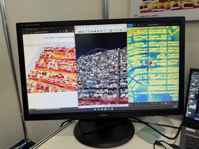 当展示ブースでは、衛星画像単眼深度推定による建物屋根3D形状生成年間平均日射量解析のデモや