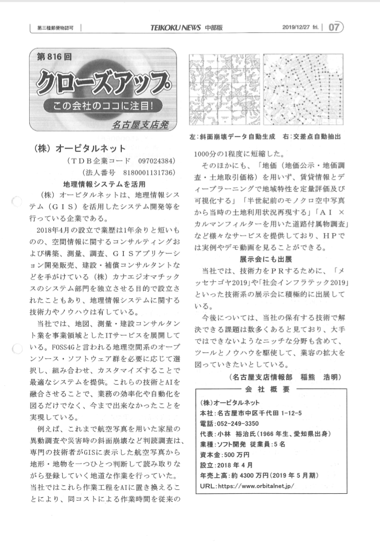 株式会社帝国データバンクが発行している情報誌 【帝国ニュース中部版(2019年12月27日発行)】の記事「第816回 クローズアップ この会社のココに注目!」において弊社が取り上げられました!