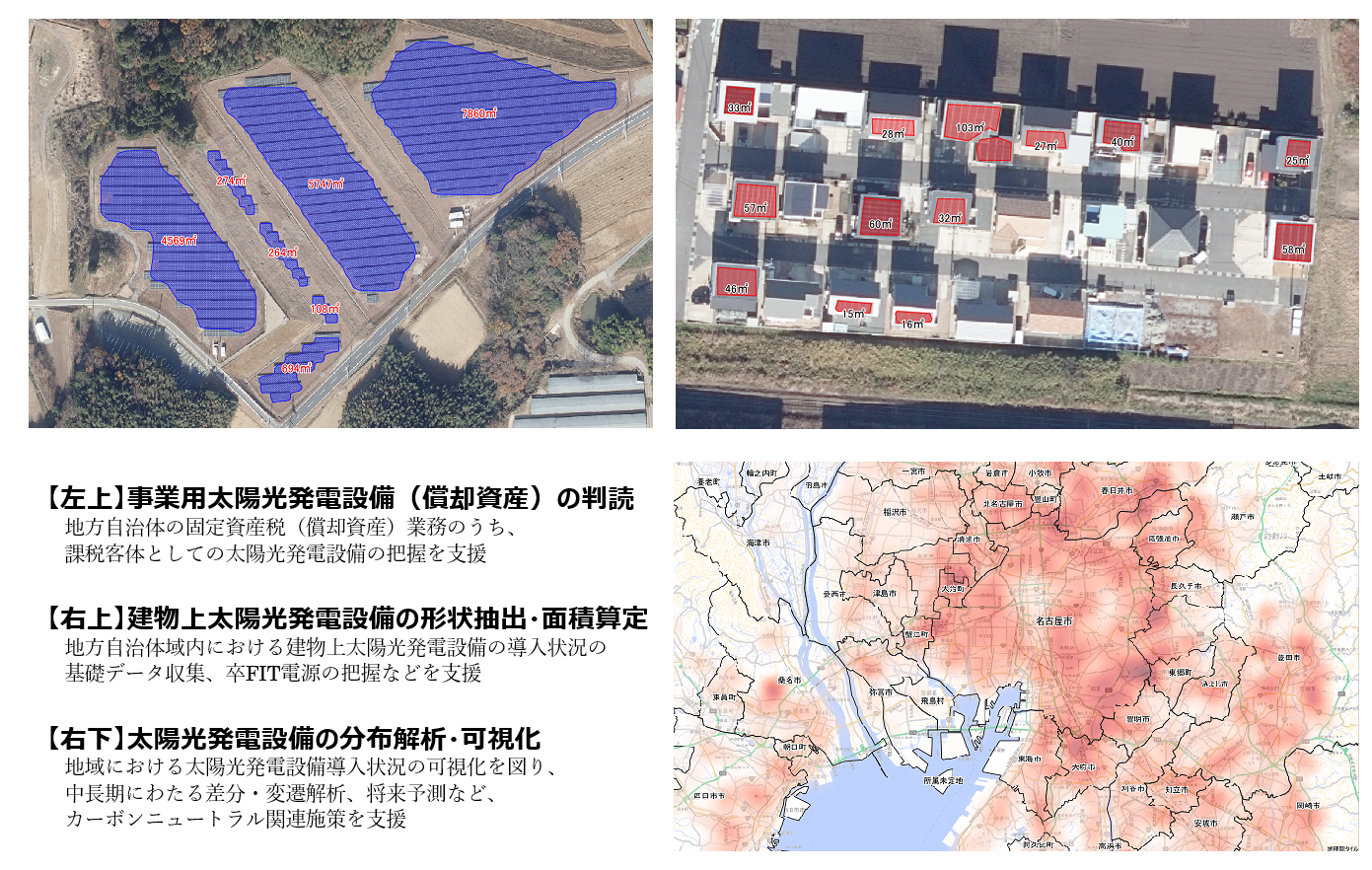 本業務提携は、地方自治体などの行政区域内において、航空写真オルソ画像データを基にAI分析を行い、行政区域内における太陽光発電設備の件数や面積、位置情報などを把握できるサービス提供を目指すものです。これにより、地方自治体では、事業用太陽光発電設備に対する償却資産税の課税および徴税業務の円滑化、政府の掲げる2050年カーボンニュートラルに向け地方自治体に求められている「地方公共団体実行計画」の策定や、「2050年二酸化炭素排出実質ゼロ表明」への活用が期待できます。