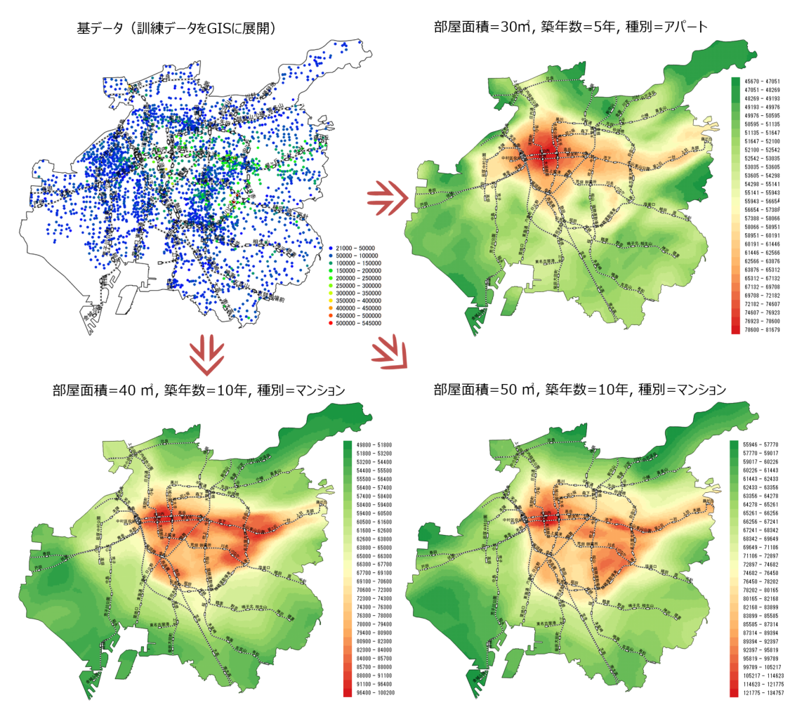 家賃は、建物が持つ価値と立地が持つ価値などの複合的な要素から形成されています。そこで土地の価格(地価)を用いずに地域内の場所の価値を家賃から導き出し相対評価できないか?というトライアルとして、部屋面積、築年数、建物種別、緯度、経度を説明変数とし、家賃を目的変数とする学習(回帰分析)を行ったのち、部屋面積、築年数、建物種別が同じ条件のもと、メッシュ状に配置した場所(緯度・経度)において賃料を予測し場所による価格差を地図上で可視化しました。