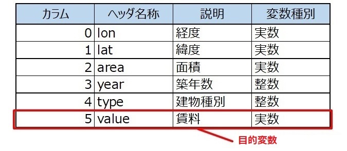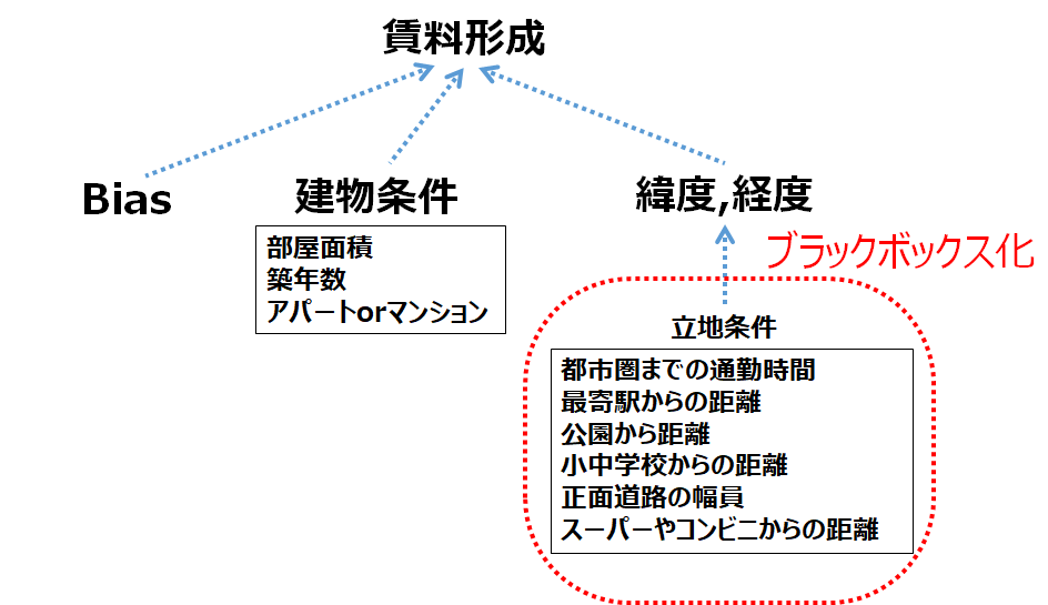 建物条件と立地条件からなる説明変数から家賃の目的変数を求める回帰分析行います。まず、(駅、学校、公園、スーパー、コンビニ)からの距離、などの立地の要素は、緯度・経度で暗黙的に示されておりブラックボックス化できます。そこで建物条件(部屋面積、築年数、建物種別)と緯度、経度を説明変数とし家賃を目的変数とします。
