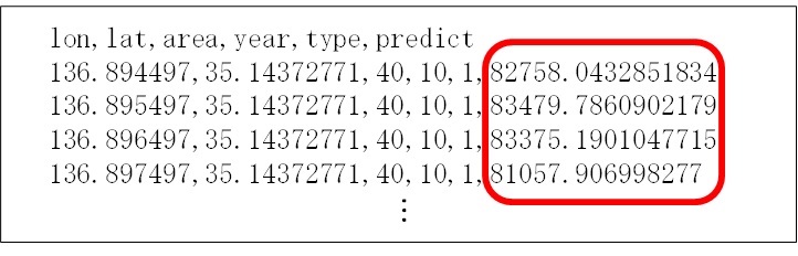 この回帰分析を大量の賃貸物件データからディープラーニングを使用して求めました。結果として、ディープラーニングの学習結果モデルから任意の建物条件と緯度経度を設定して賃料を推測することができます。
