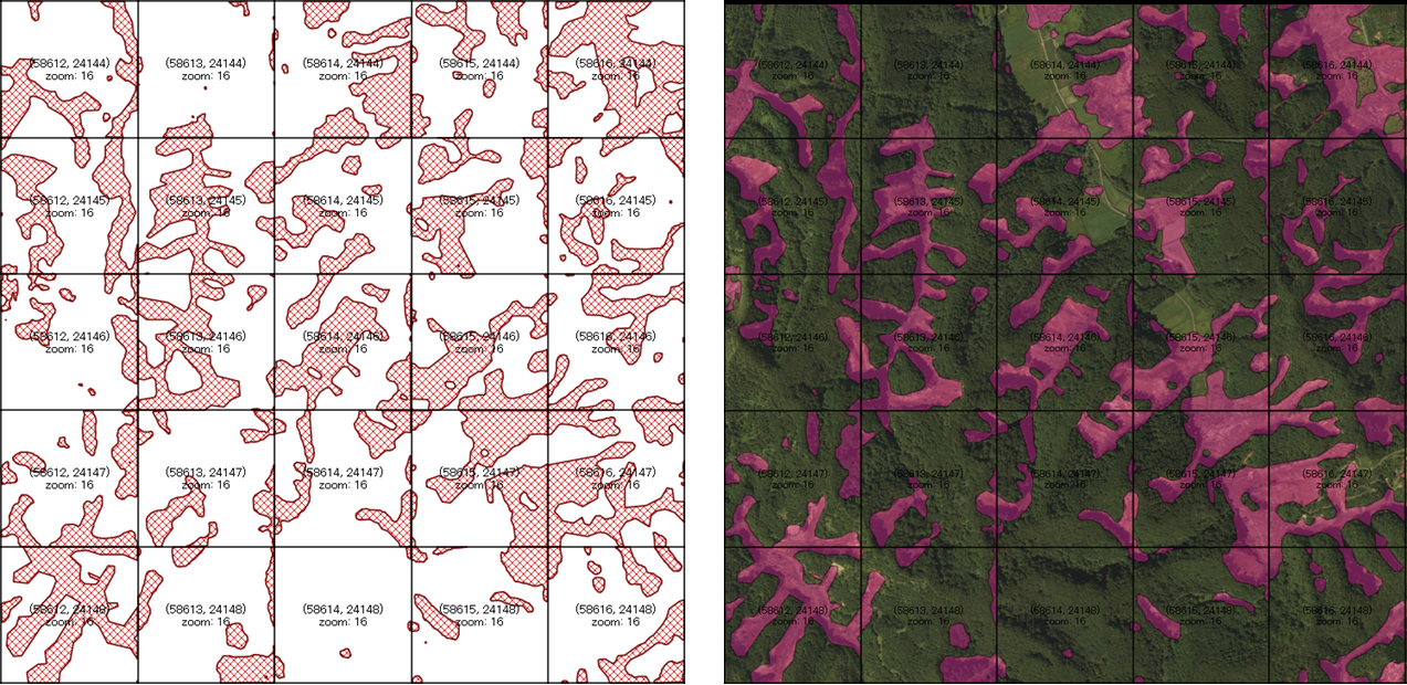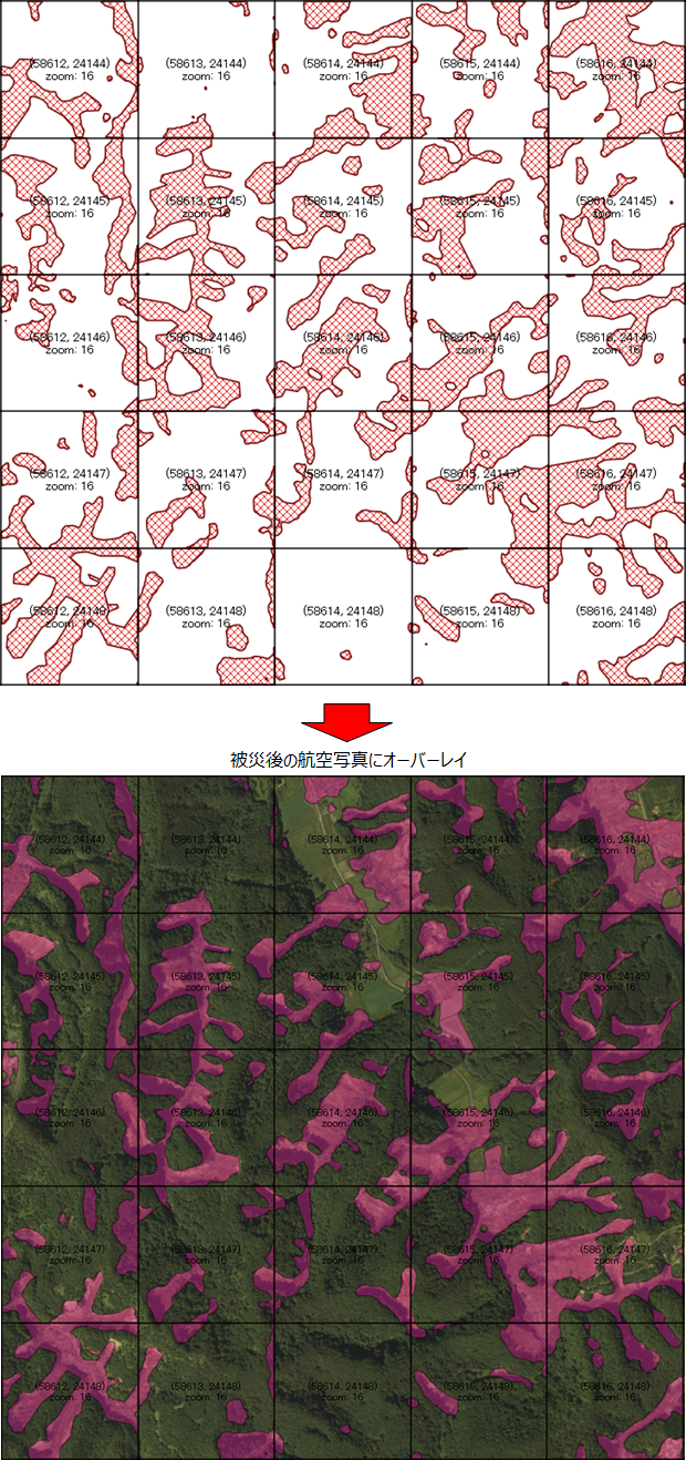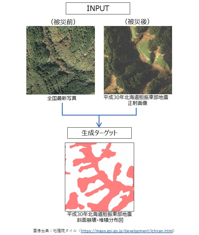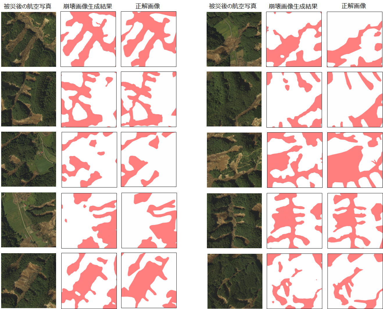 下はGANを用いて災害時に発生した斜面崩壊箇所を差分抽出により生成した例です。被災前後2時期の空中写真から有識者が被災状況を判読して作成した斜面崩壊分布図を画像生成するよう学習し、新たな災害が発生した際に、被災前後の航空写真から斜面崩壊データを生成します。
