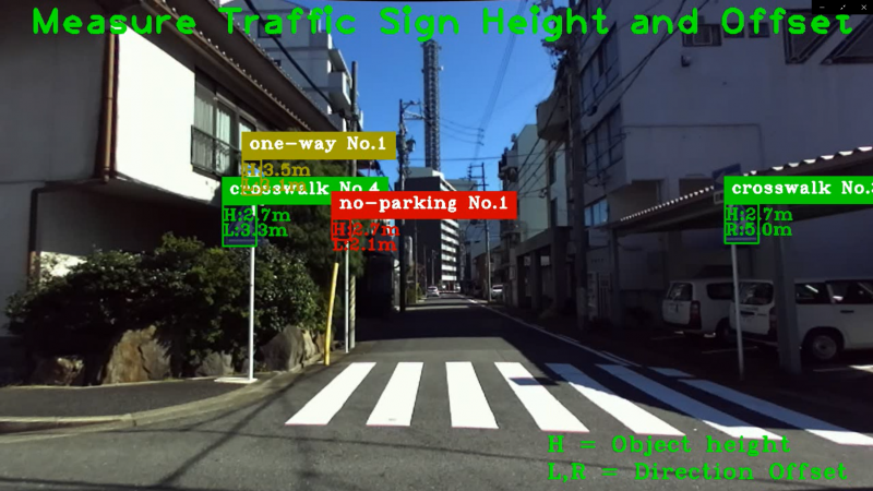 そこで、SfMとディープラーニングの物体検出技術を組み合わせて、車両に搭載したステレオカメラ映像から道路付属物を検出・追跡しつつ、3次元距離計測して付属物の高さと走行中心位置からのオフセットを計測します。物体検出が苦手としているフレームを跨いだ物体の特定は、トラッキング技術を活用します。
