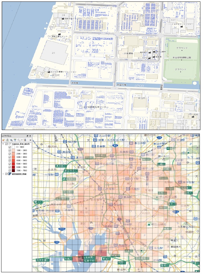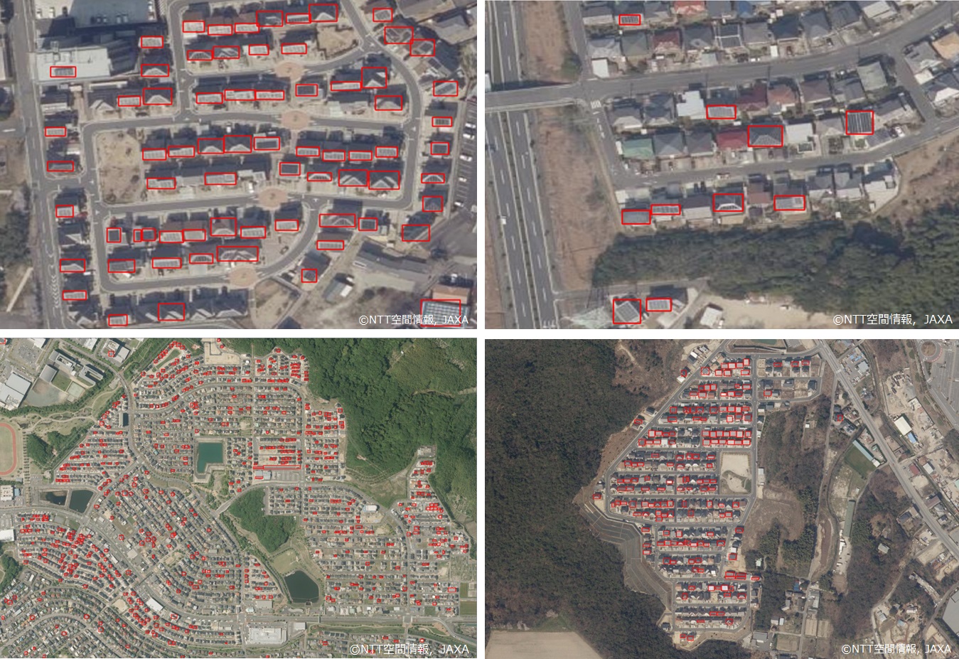 リアルタイム物体検出は、その検出速度を大量の航空写真の判読処理に活かせます。処理内容としては航空写真や衛星写真から物体検出技術を用いて特定の地物を抽出し、地物を包括する短径または代表点を様々な形式のG空間データとして出力します。下記は屋根に設置されたソーラーパネルの検出例です。処理スピードを活かして解像度25cm以上の航空写真から、愛知県・岐阜県・三重県を対象に検出を行い、座標変換、複数の地理空間データ形式への出力、空間データベースへの登録までの工程を、約6時間で完了します。検出処理を行った地物数は実に25万件以上になります。