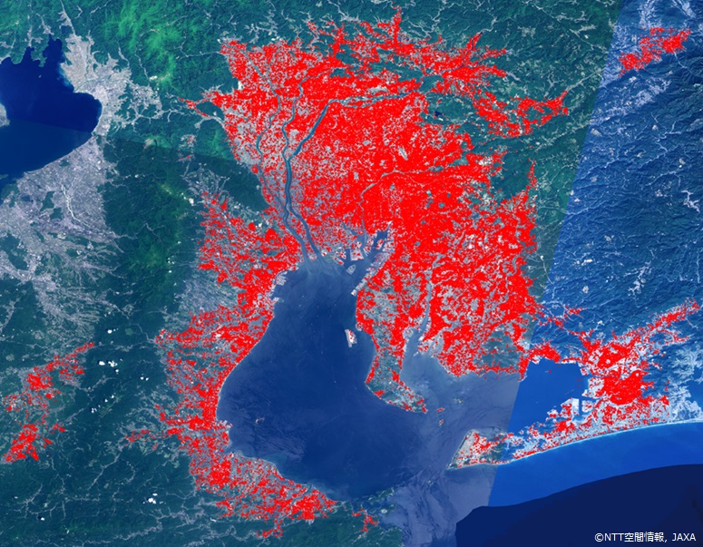 人間で判読できるものはどんなに小さなものでも人工知能でも同様に判読・抽出できます。下記は自動車の抽出例です。広範囲においても瞬時に大量の地物を判読することができるので災害時の状況把握などに効果を発揮する技術といえます。