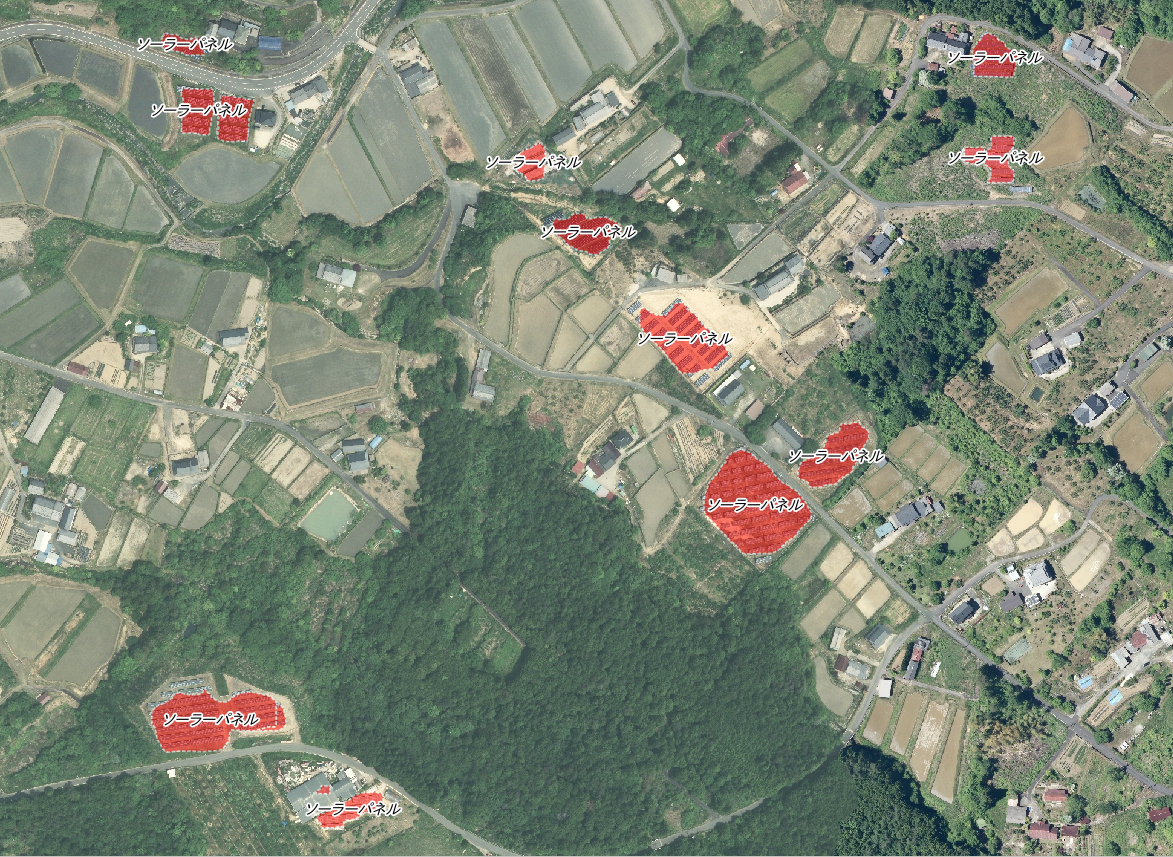 下は航空写真からソーラーパネルを抽出しポリゴンデータ化したものです。物体検出と同様、様々な地物を抽出・データ化することが可能です。