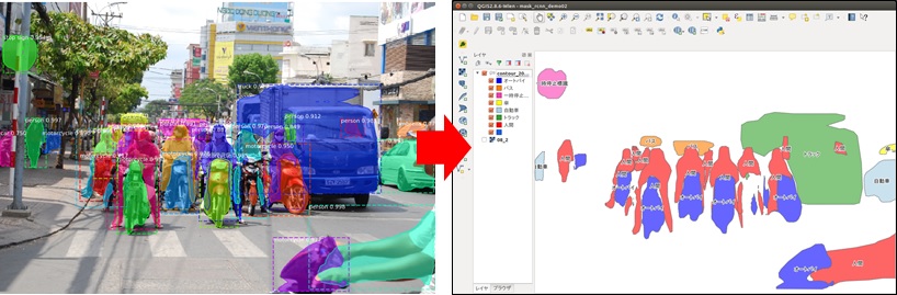 この技術を地図生成に応用します。航空写真や衛星写真から物体検出によって地物を抽出し、検出した地物のマスク画像を生成します。さらにマスク画像の輪郭をベクターデータ(ポリゴンまたはマルチポリゴン)に変換し地理座標を付与します。もちろん、GPSと加速度センサー、ジャイロセンサーを組み合わせて走行動画から地図を生成することも位置精度を除けば可能です。