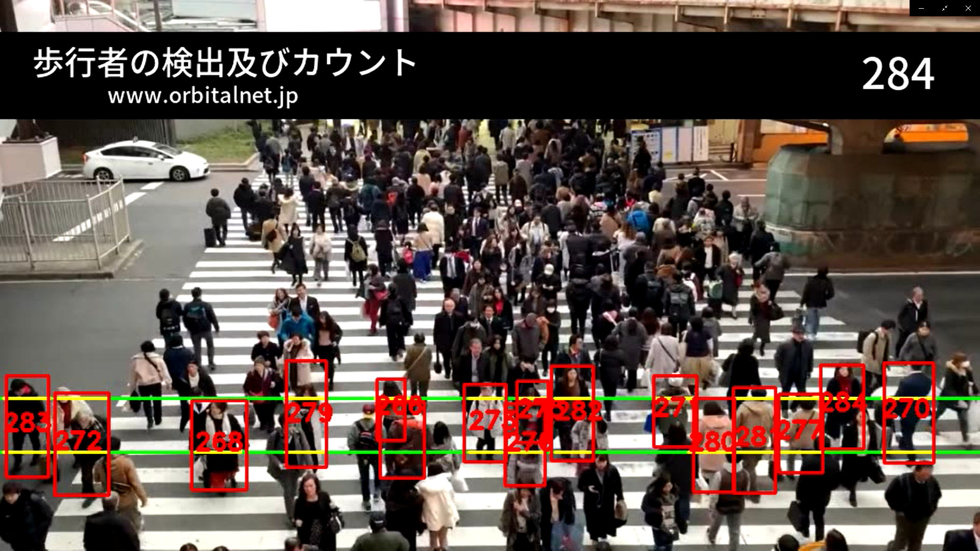 比較的移動量の予測が容易な交通車両とは異なり、人の動きは複雑で長時間に亘る追跡は困難を極めます。とりわけ横断歩道など進行方向が異なる人が交差する横断歩道では、注視する領域を絞って歩行者を検出・カウントする技術が必要になります。下はディープラーニング物体検出とカルマンフィルターという移動体追跡技術を組み合わせて検出及びカウントするデモ映像のものです。