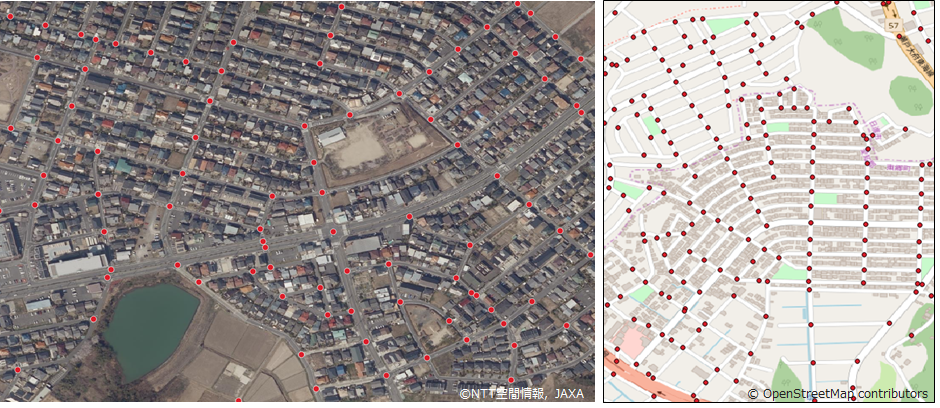 ディープラーニング物体検出は物理的な物体や地物にとどまらず、応用として概念的な無形地物の検出も可能です。例えば交差点は道路が交わる箇所(地点)で幾何学的には道路の中心線同士が交差する点(座標)で表せますが、航空写真には明示的に点が写っているわけではありません。AIはその概念を画像から学習することができます。新規に撮影した航空写真から交差点を抽出し、既存の道路ノードとの差分をとって新規に敷設された道路図化の予察に使用することができますし、そのターゲットノードとして利用できます。また、古地図との対応点として使用することもできるかもしれません。交差点に限らず、様々な無形地物の取得に挑戦することも面白いかもしれません。