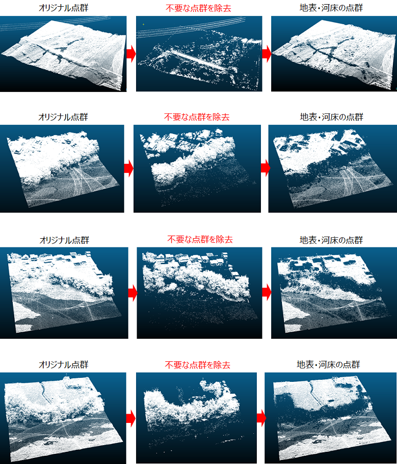 弊社は、レーザー測量・測深により取得した3次元点群データから、ディープラーニングを用いて家屋・構造物や樹木等の不要な点群を除去して、地表面と河床面以外の点群のみを取り出す、”点群フィルタリング・アプリケーション” を開発しています。